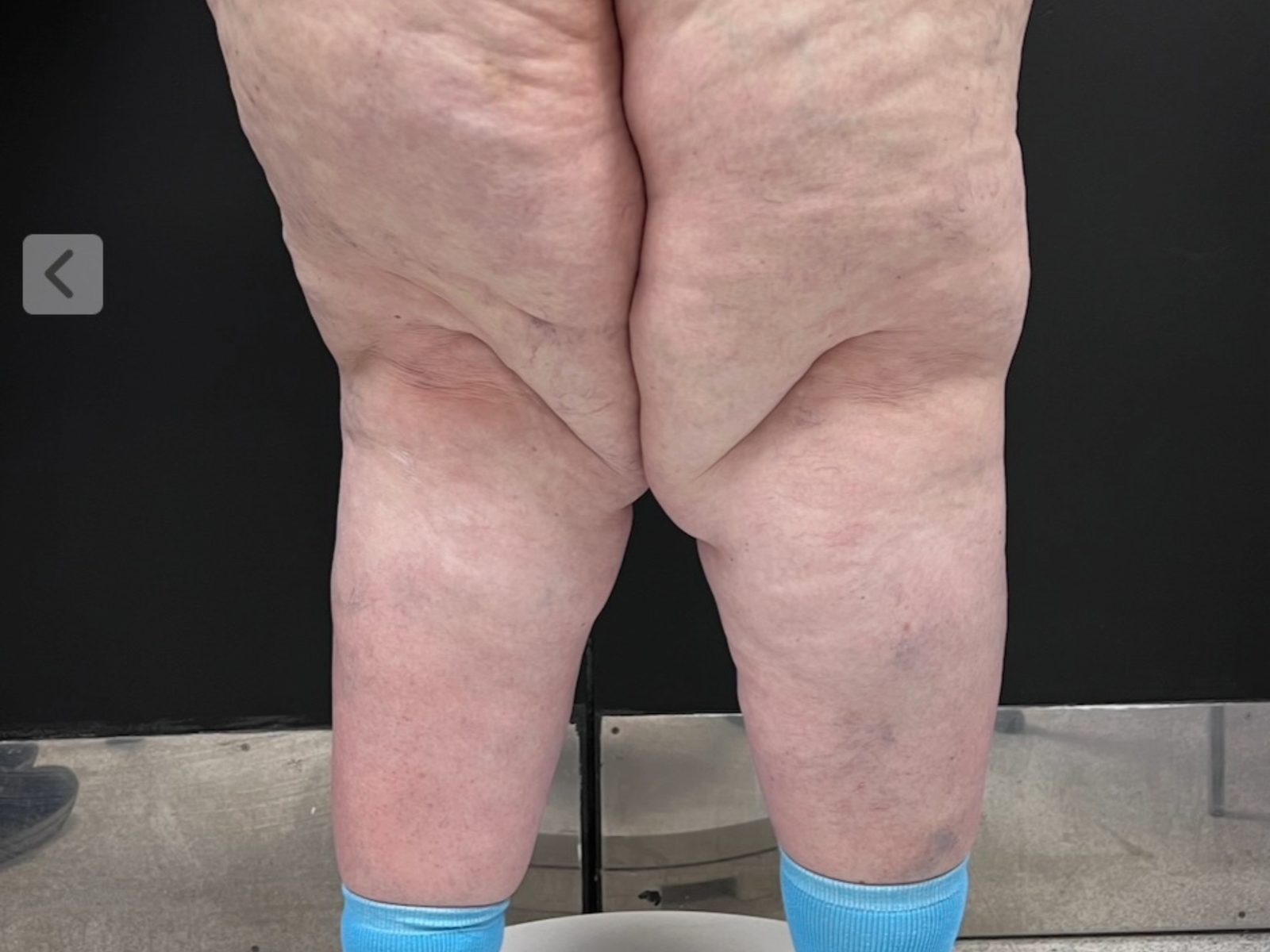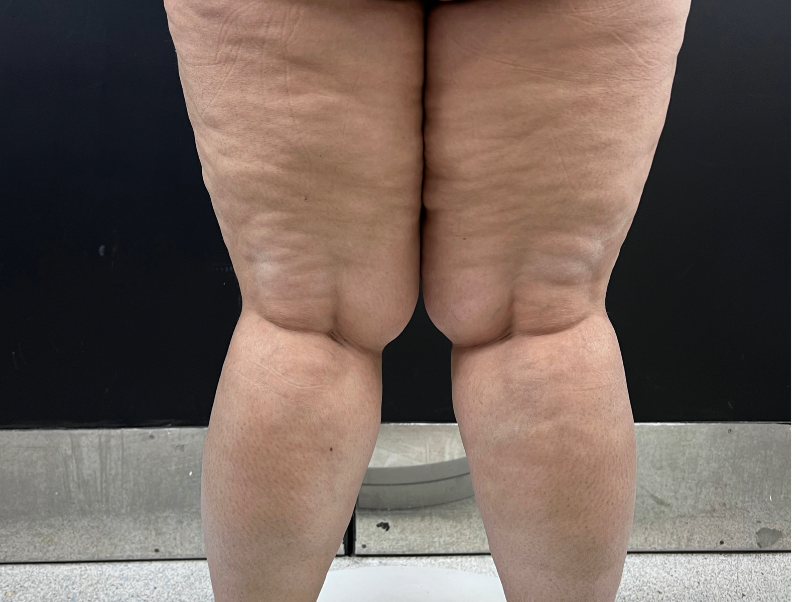 With Lipoedema, the swelling involves both legs (or arms) equally and is generally concentrated in the thighs, lower legs, and ankles. This disproportionate fat distribution gives rise to a column-like appearance. In some cases, it can also affect the arms.